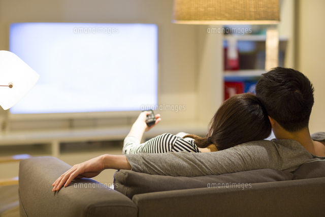 Young Couple Watching Tv On Living Room Sofa の写真素材 イラスト 素材 アマナイメージズ